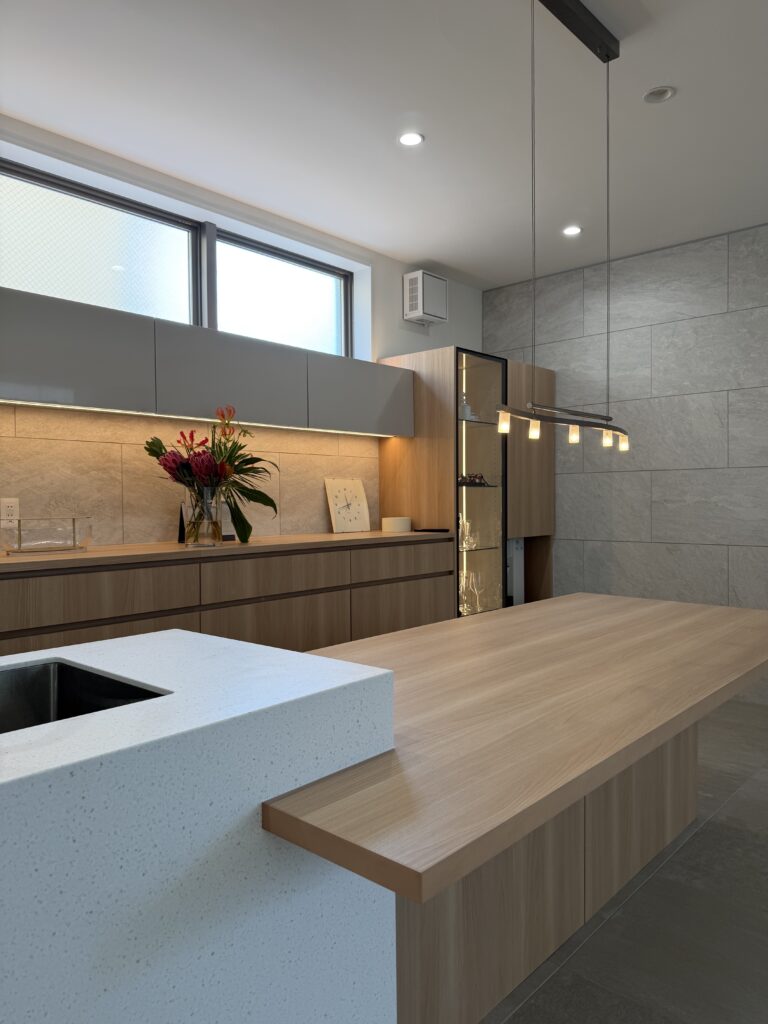 照明のラインが生み出す陰影が空間全体に静かなリズムをもたらし、キッチンで過ごす時間をより豊かなものへと導きます。